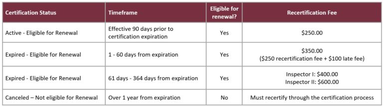 To be eligible for renewal, Inspectors must meet the following requirements within the renewal term of their certification (i.e. within the 24 months of certification or renewal):