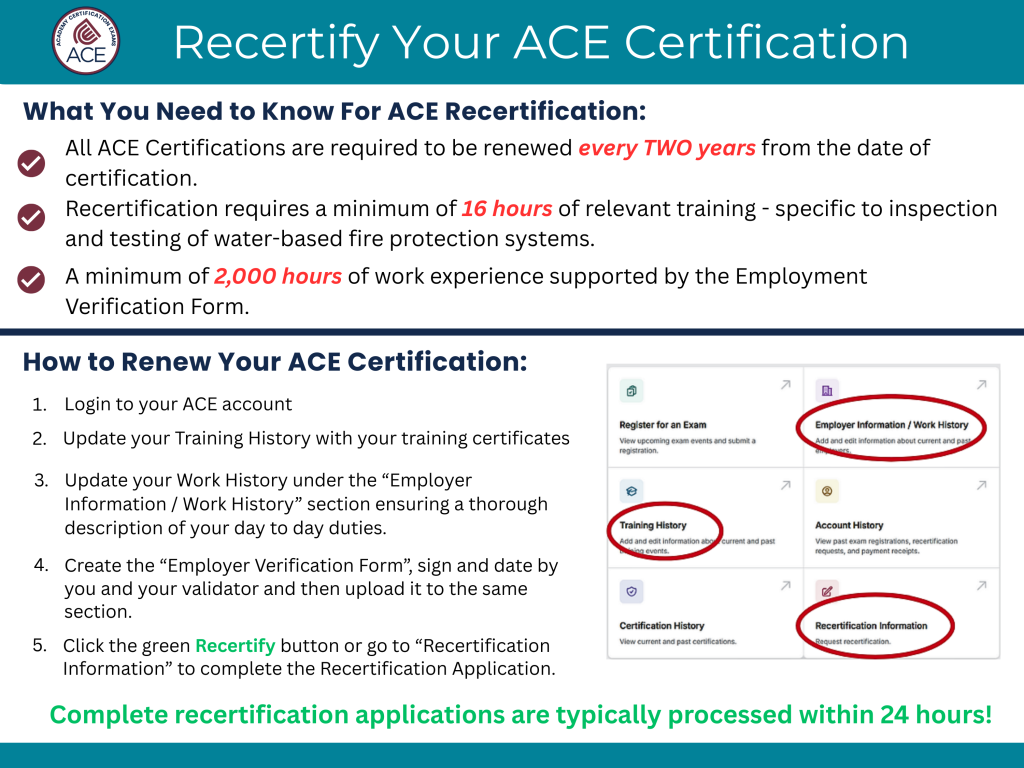 All ACE Certifications, including Water-based Fire Protection Inspector Level I, Level II and Level III, are required to be renewed every two years.