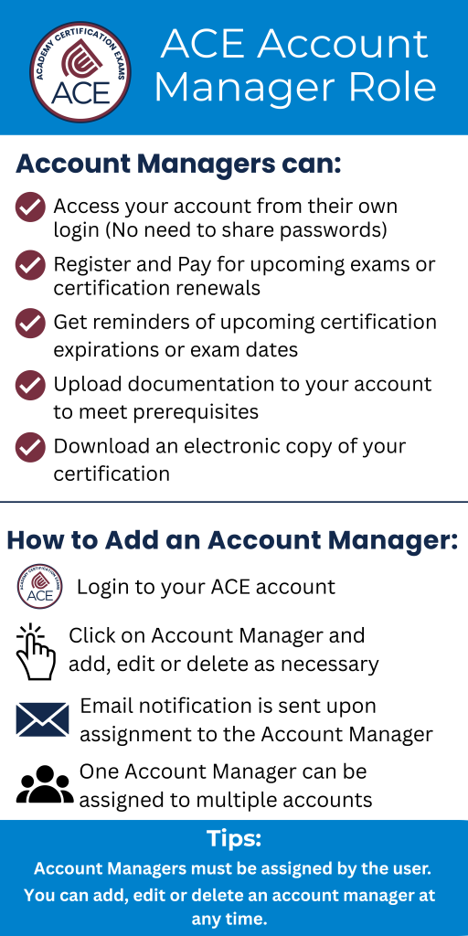 Academy Certification Exams (ACE) understands that unexpected conflicts may come up.  ACE will make every effort to transfer participants to new test dates should the participant be unable to take the exam as scheduled.  Participants can transfer the registration to a future exam date at no fee.  Please note, that dates/exam transfers are subject to availability.  Transfers should be requested at least three business days prior to the exam, if possible.  One transfer per registration is permitted.  Additional transfers may result in a change fee being applied.  Please note, if any of the verified eligibility terms change prior to the next exam date, the participant must requalify for the exam and may be required to pay an assessment fee.